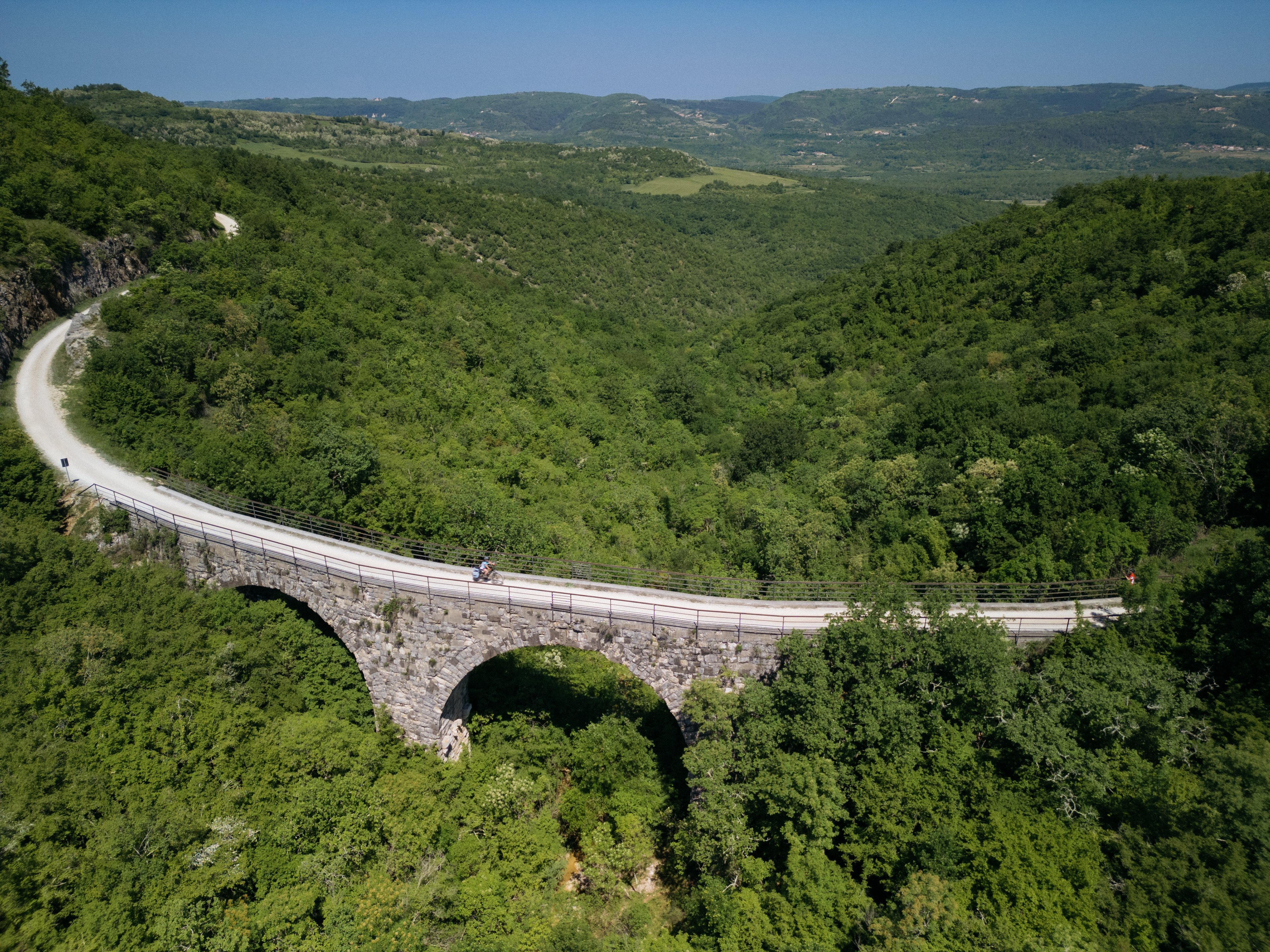The Parenzana runs through tunnels, over viaducts, and past medieval hilltop towns like Grožnjan and Motovun. With moderate gradients and mixed surfaces (asphalt, gravel, compacted earth), it’s ideal for hybrid, gravel, and e-bike riders.